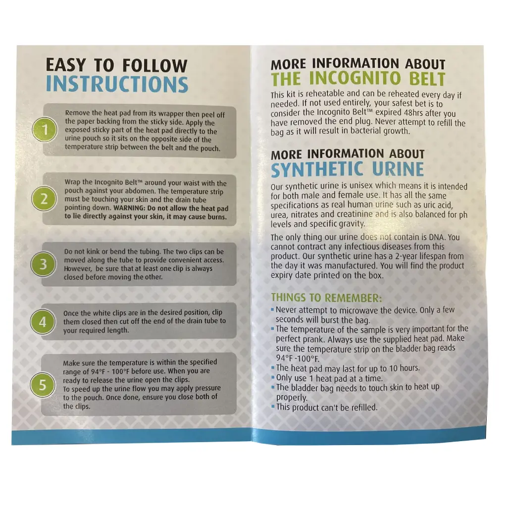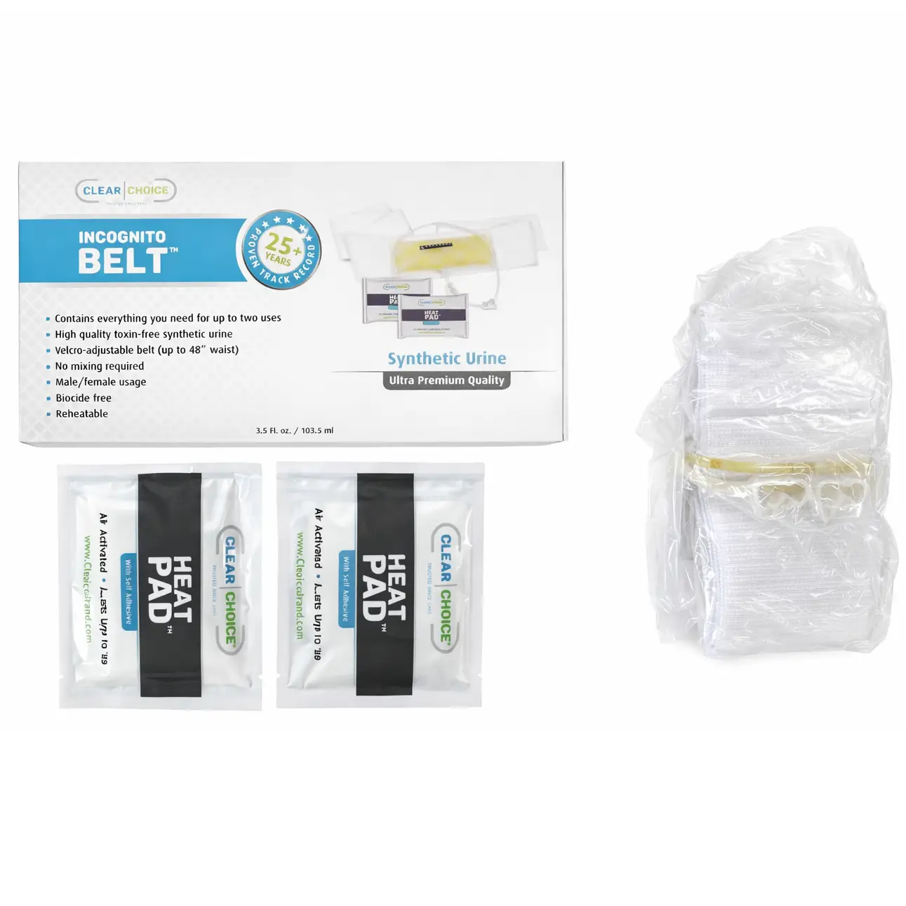 The Clear Choice Incognito Belt is the premium solution you need for a completely discreet experience. This ultra-premium kit features a “gravity-operated” device designed to deliver pre-mixed synthetic urine that is 100% effective, toxin-free, and undetectable. The system is lightweight and wraps securely around your waist, easily hidden under clothing for maximum privacy.